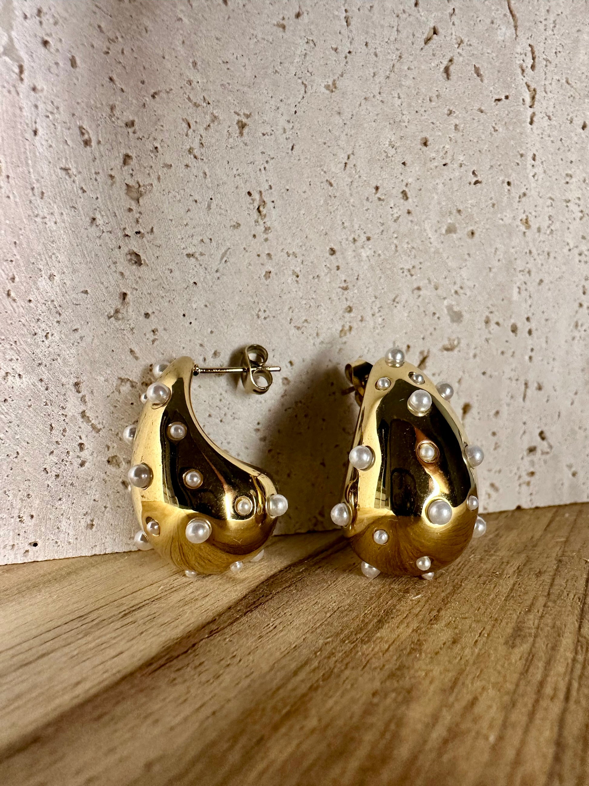 Ces créoles dorées au design sculptural sont parsemées de petites perles nacrées qui rappellent des gouttes de rosée posées sur des feuilles dorées.
